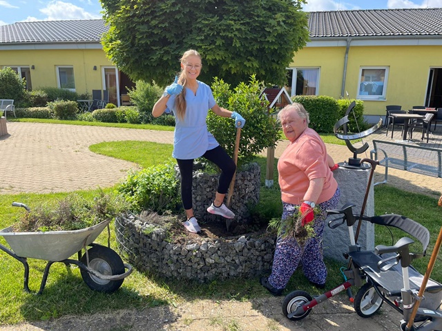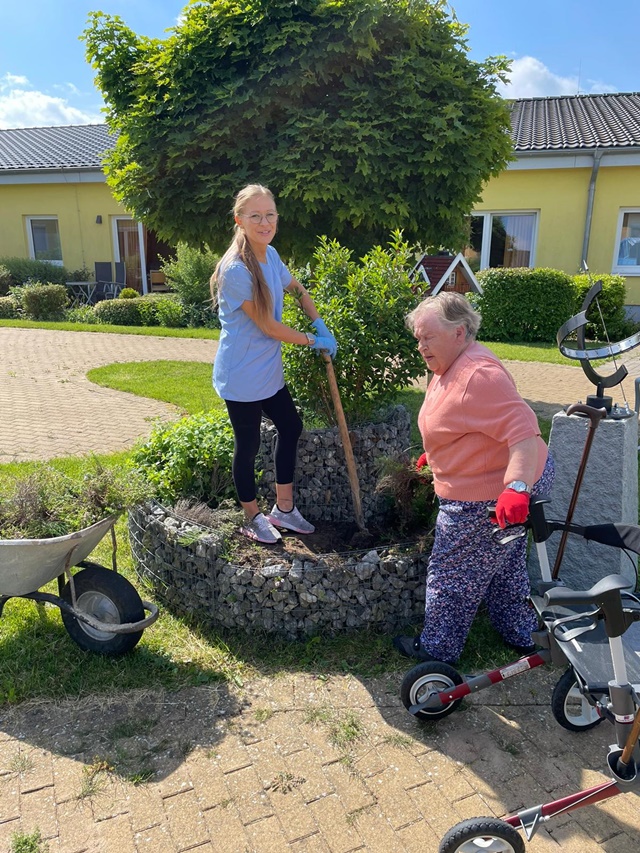 Nun war es endlich soweit. Das Wetter war schön und die Lust endlich unsere Kräuterspirale auf Vordermann zu bringen groß. Frau Blahr ,unsere Bewohnerin, arbeitet für ihr Leben gern im Garten. Es war nicht nur ihr Hobby sondern auch ihre Leidenschaft. Sie hatte in ihrem vorherigen Zu Hause einen großen Garten mit vielen Nutzpflanzen, Kräutern und Blumen. Sie hat sich so gefreut, endlich mal wieder im Garten tätig zu sein. Sie hat aber auch zwischendurch immer wieder bemerkt, dass sie nicht mehr die Kraft und Ausdauer hat wie vor 20 Jahren. Am Tag danach hatte Frau Blahr richtig Muskelkater und war noch erschöpft, sie konnte das gar nicht verstehen. Denn damals hat sie das doch alles mit links gemacht.