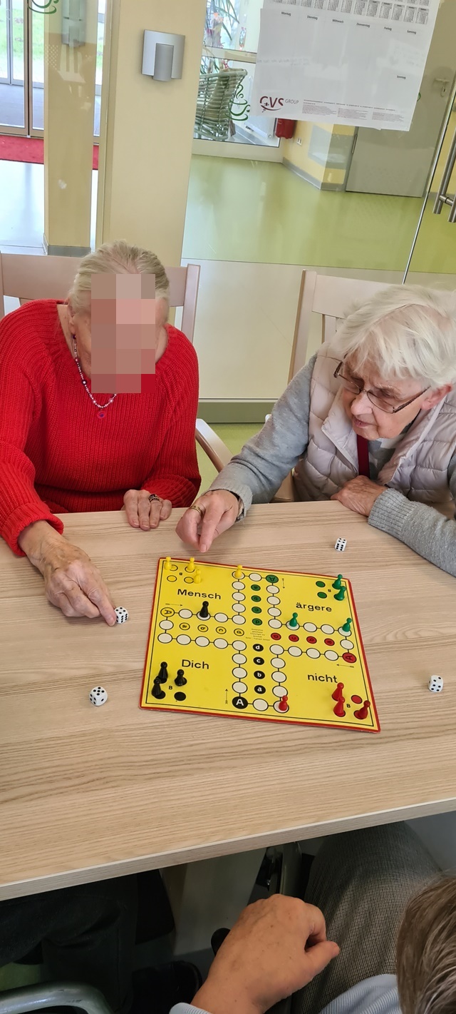 Man sollte nicht glauben, wie schwer es dem einen oder anderen fällt, sich auf diese Dinge zu konzentrieren. Obwohl unsere Bewohner sehr oft Mensch Ärgere Dich Nicht mit ihren Kindern und Enkelkindern gespielt haben, wird die Spielweise doch vergessen oder es fällt ihnen schwer sich längere Zeit auf diese Sache zu konzentrieren. Außerdem ist die Hand-Auge Koordination nicht mehr so einfach und es bereitet Schwierigkeiten die kleinen Figuren zu setzen oder gar den Würfel zu bedienen. Auch längere Zeit zu lesen ist für viele Bewohner nicht mehr so einfach. Sie geben an, dass nach einiger Zeit die Buchstaben verschwimmen und sie dann nur noch verwaschen sehen können. Nichts ist mehr wie früher, dieses Problem stellen wir leider tagtäglich in unserer Einrichtung fest und auch die Bewohner merken es natürlich selbst, dass sie nicht mehr Anfang zwanzig sind.