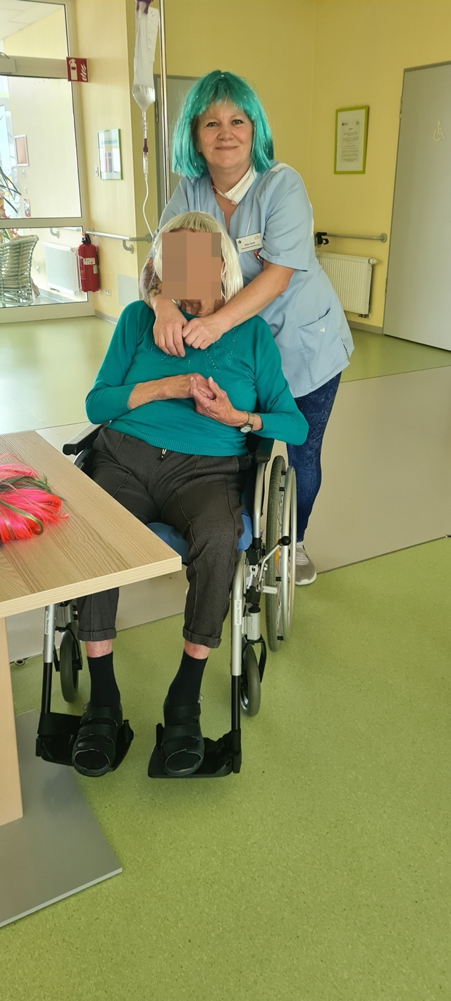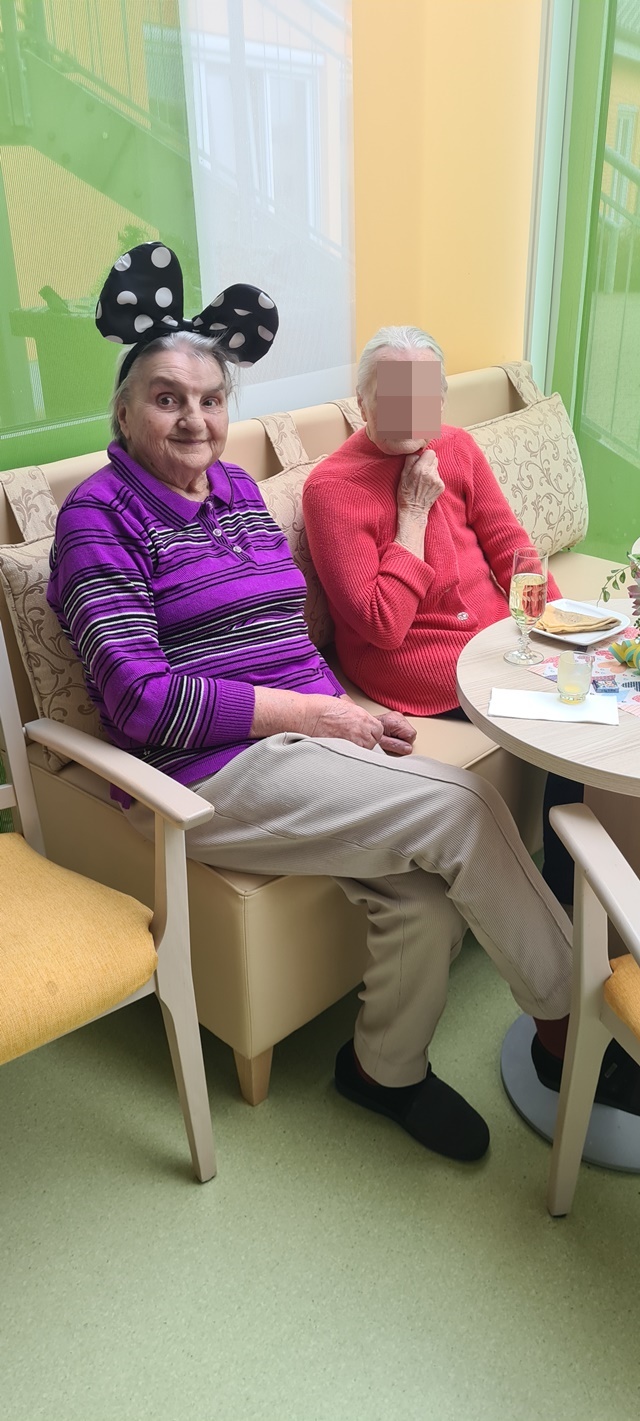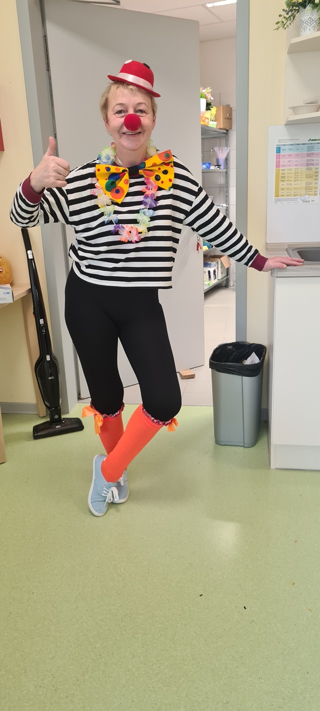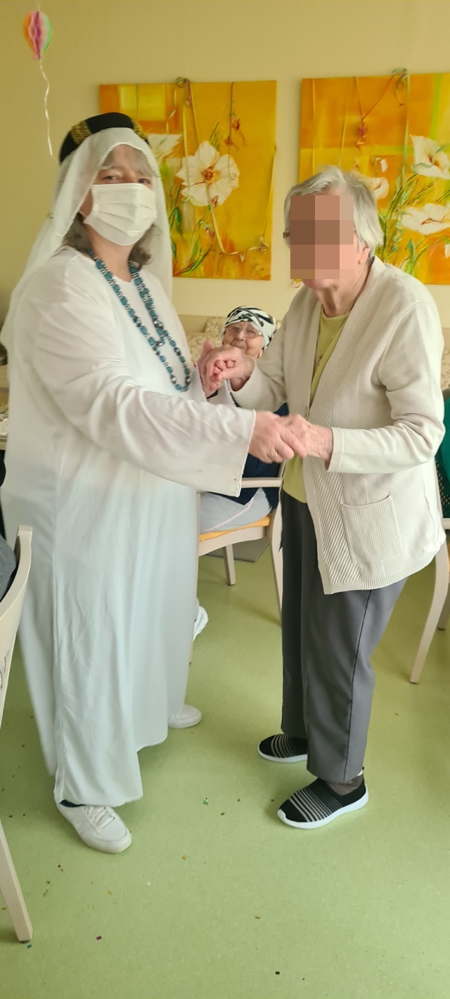 Natürlich haben sich nicht nur die Bewohner verkleidet und herausgeputzt, sondern auch die Mitarbeiter. Aus unseren Faschingskisten haben wir tolle Kostüme, Perücken, Haarreifen und Hüte herausgeholt und alle damit verschönert.
