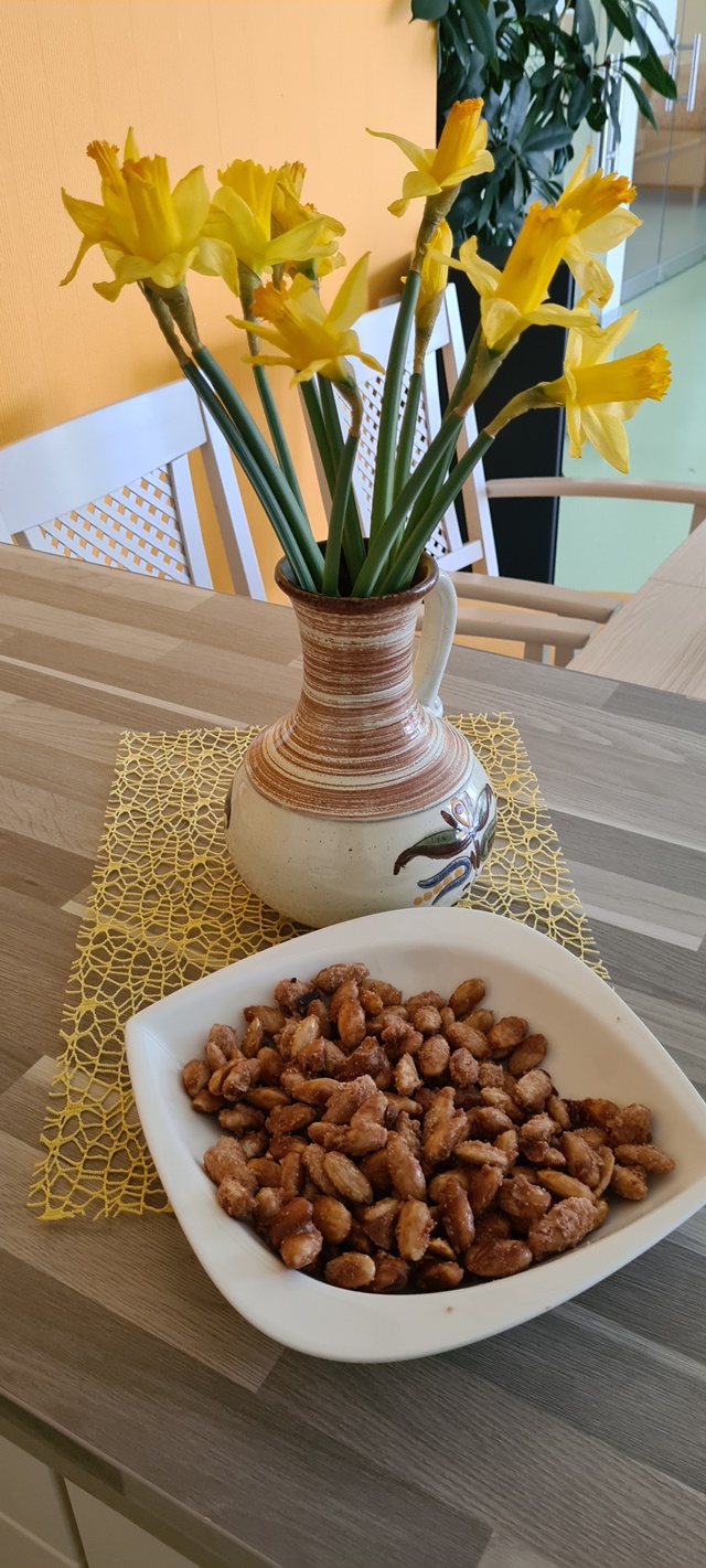 Bei diesem kalten Regenwetter haben wir uns gedacht es uns in unserem Haus gemütlich zu machen. Gemeinsam mit unseren Bewohnern haben wir gebrannte Mandeln hergestellt und in trauter Runde während wir Karten gespielt haben genascht. Im ganzen Haus hat es gerochen, wie auf dem Weihnachtsmarkt. Alle Bewohner und auch Mitarbeiter kamen ins unser Wintergartencafè und fühlten sich magisch vom Duft angezogen.