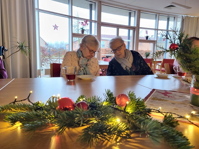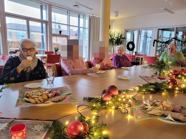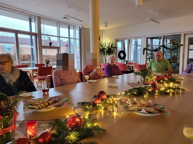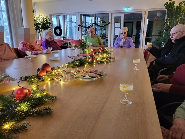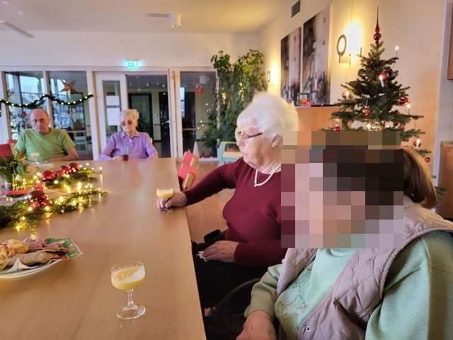 Um gemeinsam auf das Weihnachtsfest anzustoßen, trafen wir uns am 24.12. in gemütlicher Runde im großen Saal. Wir unterhielten uns über die verschiedenen Weihnachtstraditionen und Erlebnisse aus vergangenen Weihnachtsfesten. Es wurde viel gelacht und in Erinnerung geschwelgt. Wir sangen gemeinsam Weihnachtslieder und hörten uns bekannte Weihnachtsgedichte an. Es war ein sehr schöner Vormittag gewesen.