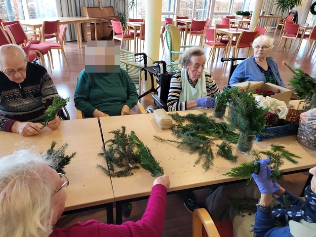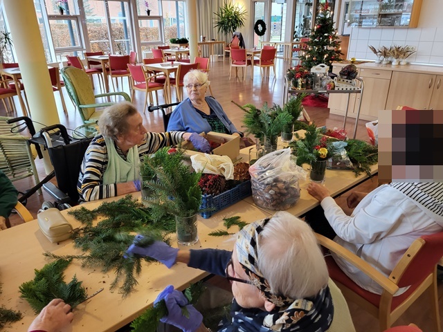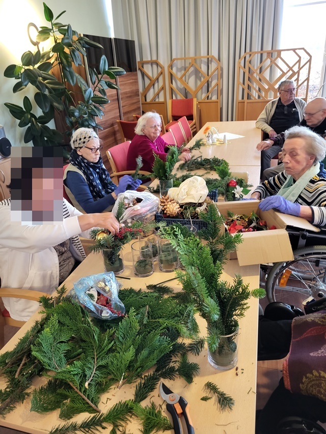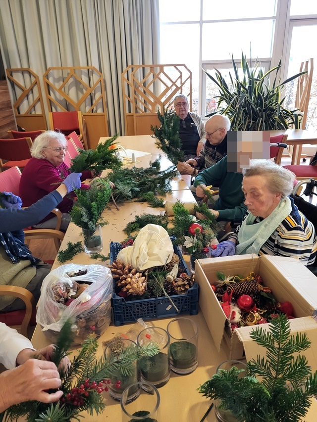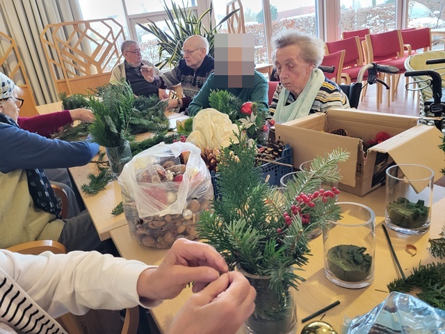 Die Vorweihnachtszeit ist immer die schönste Zeit im Jahr. Auch unsere Bewohner mögen diese Zeit besonders gerne. Da der erste Advent vor der Tür stand, nutzen wir am 23.11. die Möglichkeit kleine Adventsgestecke anzufertigen. Es wurde fleißig geschnitten, gesteckt und dekoriert. Alle Bewohner waren mit viel Freude und Spaß daran beteiligt. Auch wurde gerne über eigene Erlebnisse und Erinnerungen aus der Weihnachtszeit erzählt.
