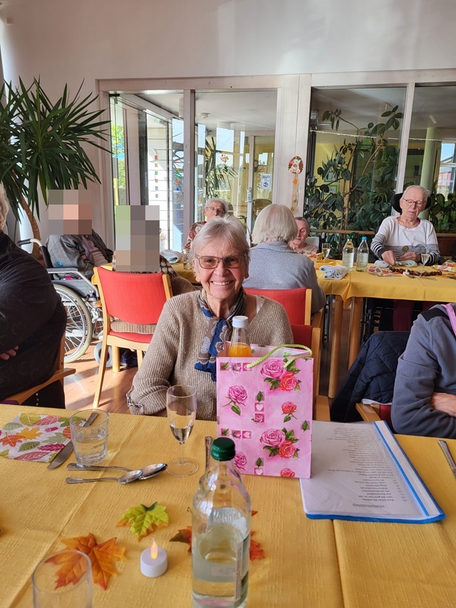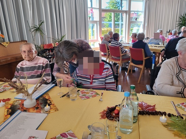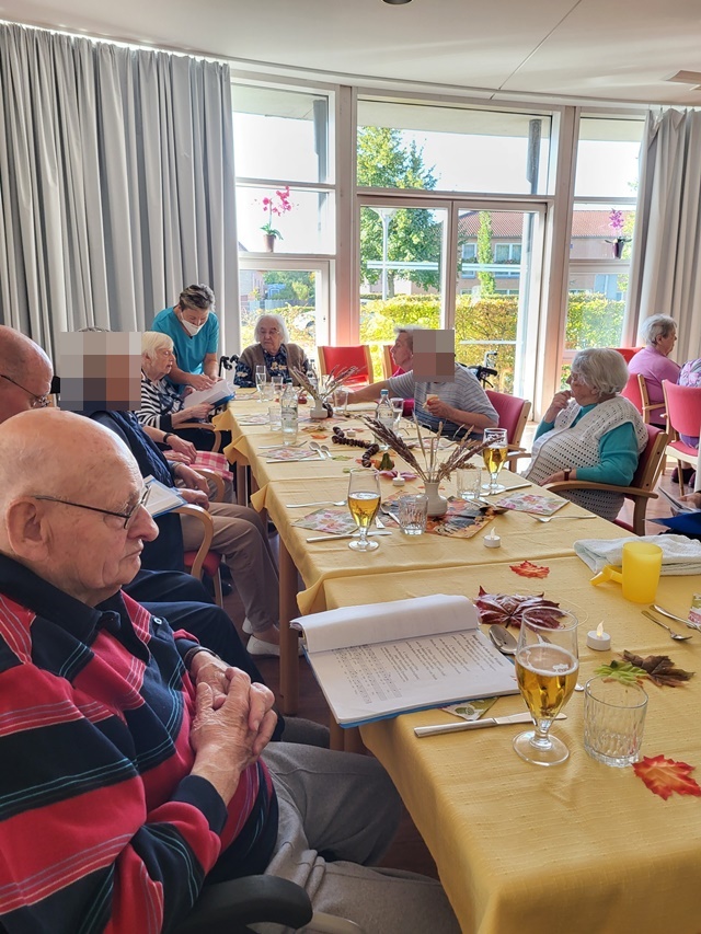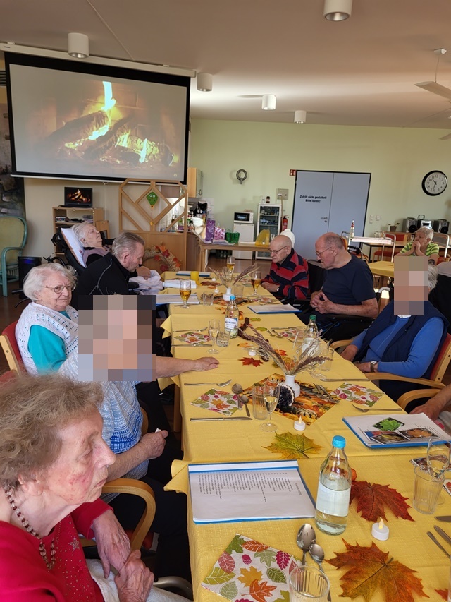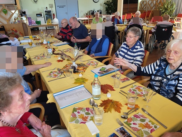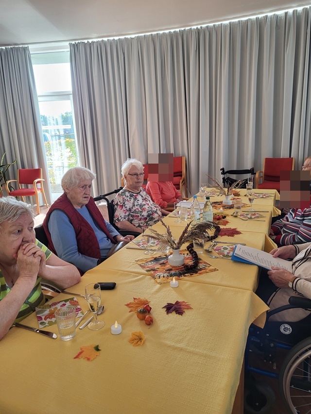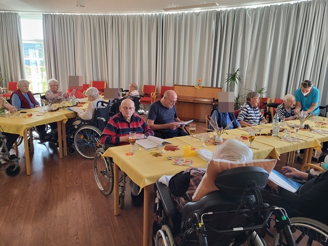 Bunt gefärbte Blätter zeigen uns nun so langsam, dass der Herbst Einzug gehalten hat. Daher fand bei uns am 11.10. unser Herbstfest statt, um den Herbst gebührend einzuläuten. Unser fest begann schon am Vormittag. Es wurden Herbstgedichte vorgetragen und gemeinsame Lieder gesungen. Viel Spaß machte unseren Bewohnern das vorbereitete Quiz rund um den Herbst. Es wurde fleißig geknobelt. Der Höhepunkt war die Auswertung von unserem Kürbis schätzen. In den Tagen vor unserem Fest hatten alle Bewohner die Möglichkeit das Gewicht des Kürbis zu schätzen. 5 Bewohner lagen mit ihren Schätzungen sehr dicht an der Lösung und erhielten einen kleinen Preis hierfür. Für das leibliche Wohl war zudem auch bestens gesorgt. Es wurde ein 3 Gänge Menü zum Mittag serviert. Dies schmeckte allen Bewohnern sehr gut. Es wurden angeregt Gespräche untereinander geführt und zu bekannten Schlagern geschunkelt. Wir hatten alle einen sehr schönen gemeinsamen Vormittag und genossen die gemeinsame Zeit.