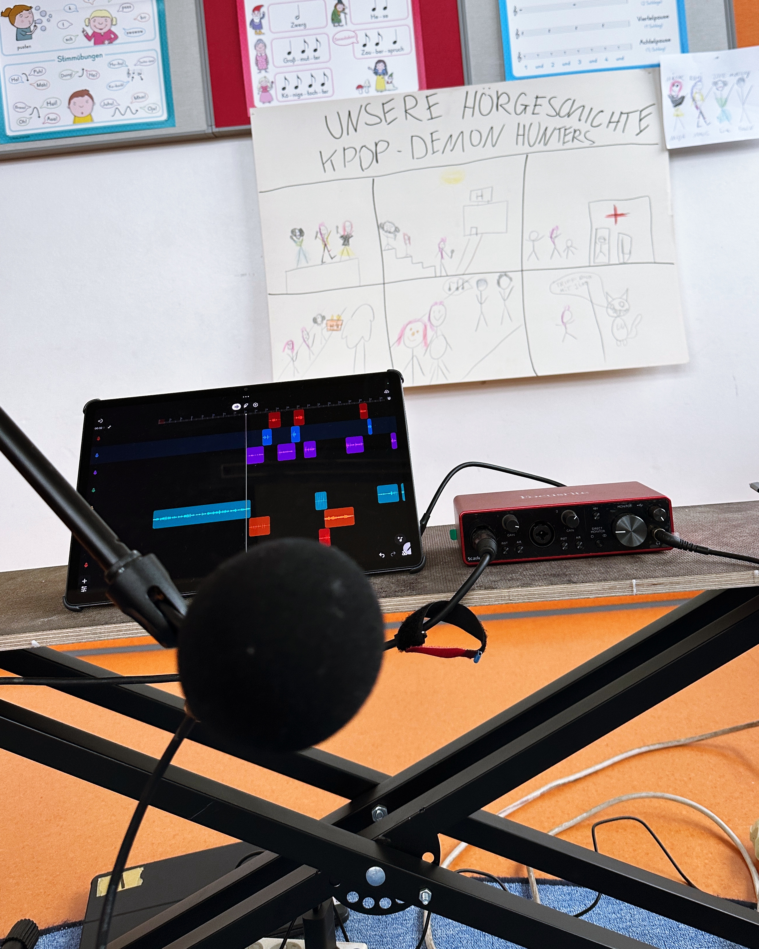 Besonders stolz sind wir auf unsere eigene Hörgeschichte, die die Kinder von der ersten Idee bis zur fertigen Aufnahme mit dem Mikrofon umgesetzt haben.