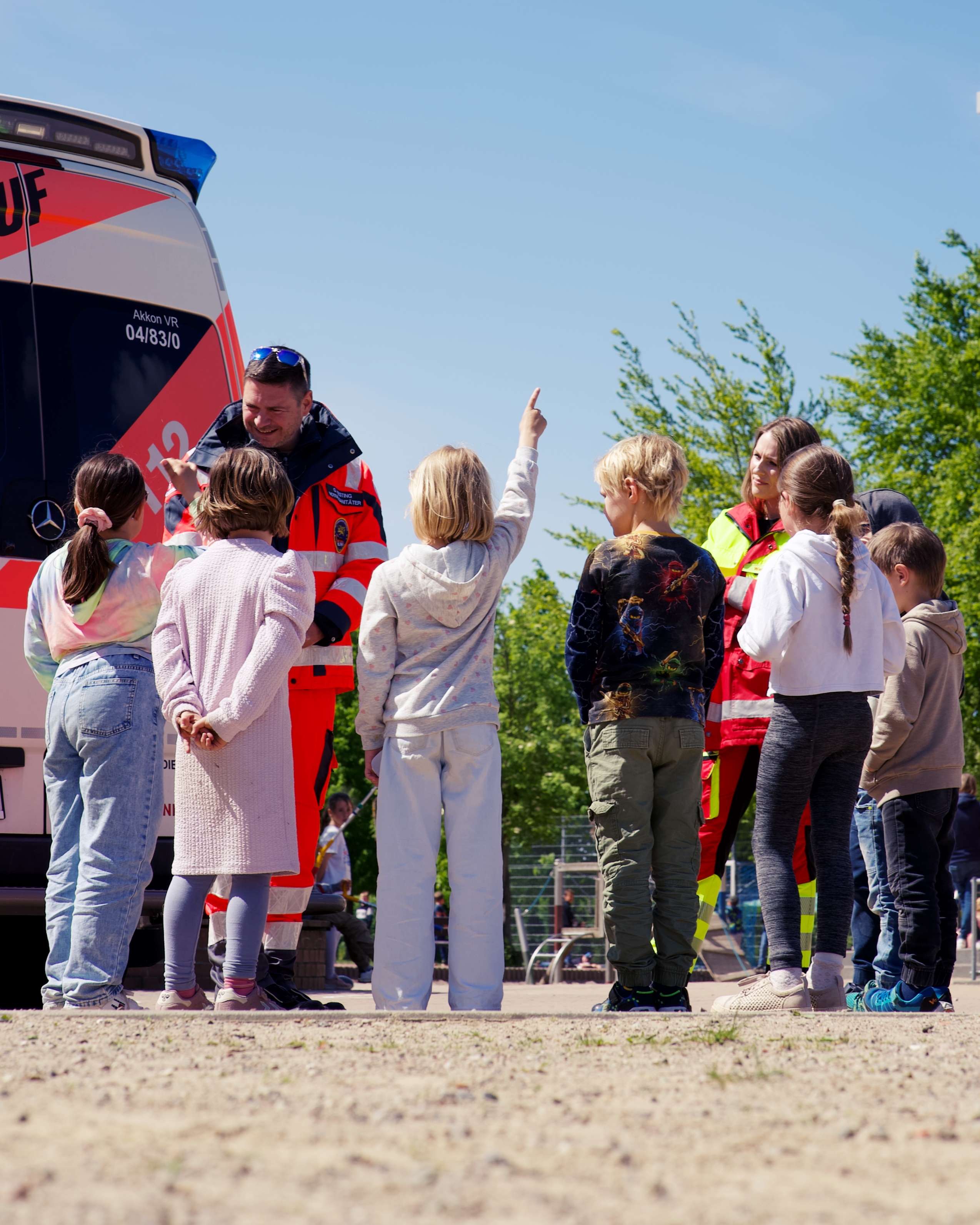 Ein echtes Highlight war jedoch der Besuch der Johanniter-Unfall-Hilfe, die das Projekt mit großem Engagement unterstützt haben. Am Donnerstag rollten Sie mit einem echten Rettungswagen inklusive Notfallsanitäter auf unseren Hof. Es war viel Raum zum Staunen, Fragen und Entdecken.