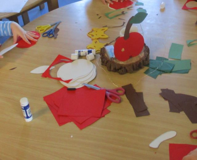 Apfelpuzzle - Auf einem Basteltisch lagen verschiedene Apfelstücke bereit und diese mussten die Kinder wieder zusammenpuzzeln. Hier konnten die Kinder ihre Konzentration und ihr logisches Denken trainieren.