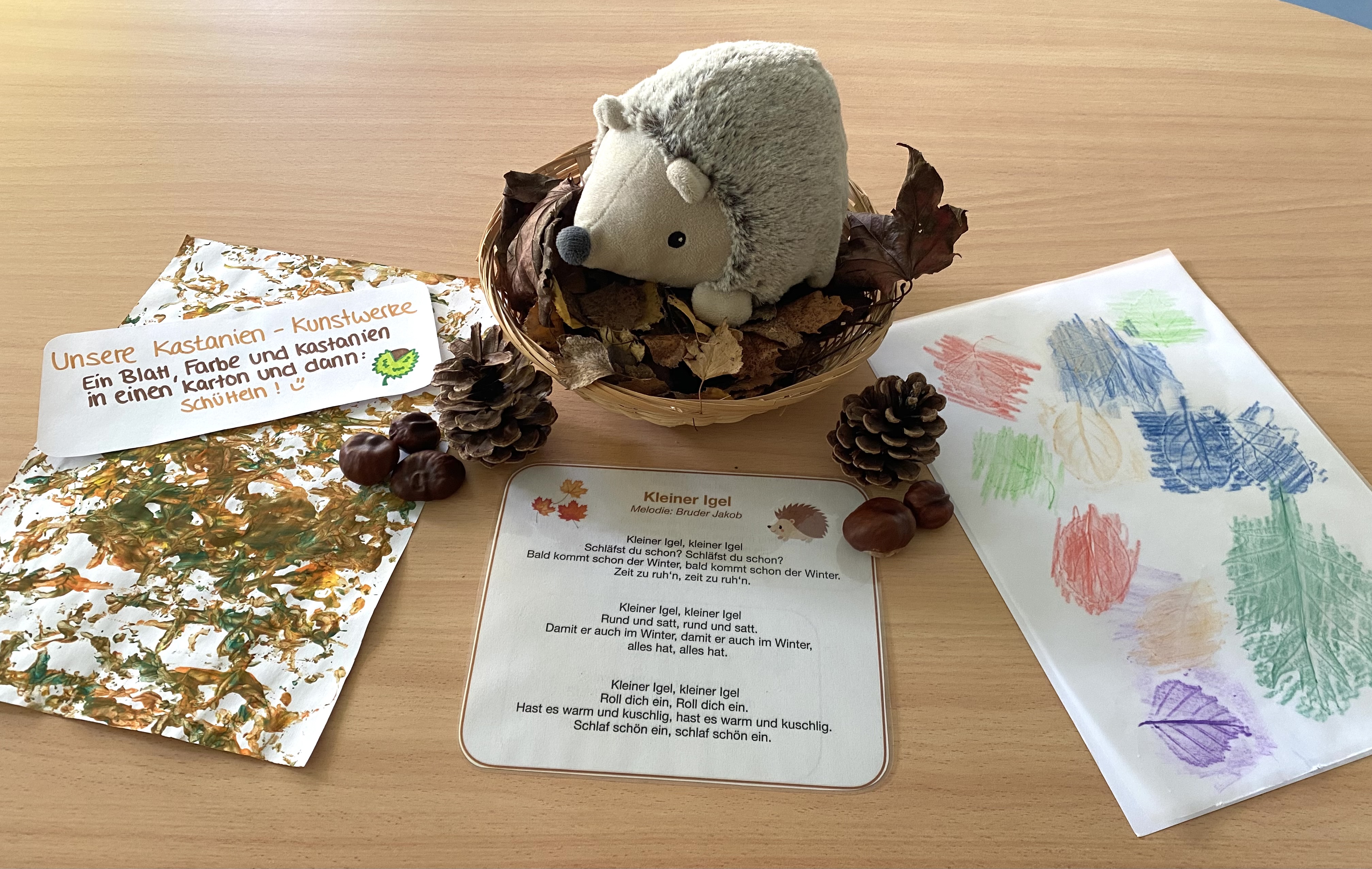 Mit viel Freude basteln und spielen wir mit Naturmaterialien wie Kastanien und BlÀttern. So erleben schon unsere Kleinsten, wie vielfÀltig die Natur ist und wie wir sie in unseren Alltag einbeziehen können.