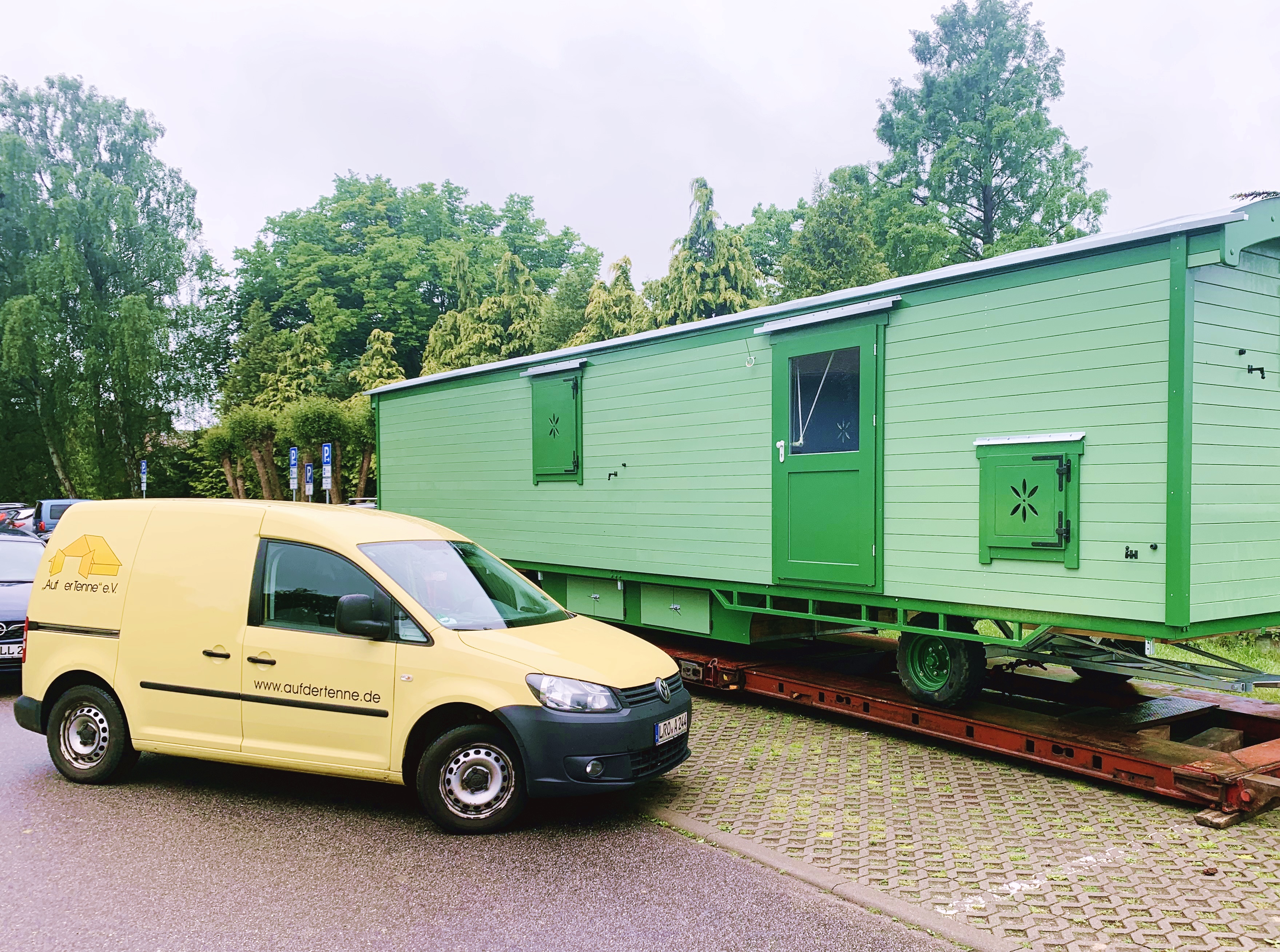 Mit Hilfe eines Traktors, vieler geübter Handgriffe und unter fachkundiger Anleitung wurde der Bauwagen sicher auf seinem neuen Stellplatz positioniert. Der gelbe Transporter unseres Trägers „Auf der Tenne e.V.“ begleitete den gesamten Aufbau und unterstrich die gute und lange geplante Zusammenarbeit zwischen Träger, Bauhof Rövershagen, Team und externen Helfern. Ein aufregender Tag für Groß und Klein!