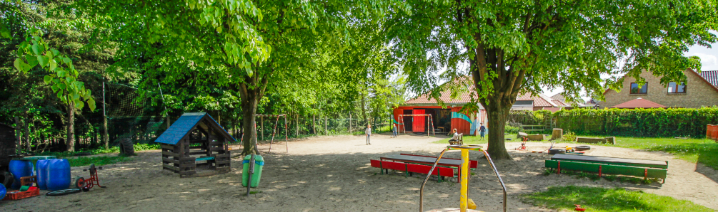 Das großzügige Freigelände von ca. 6000 m² bietet zu jeder Jahreszeit interessante Spiel- und Bewegungsanreize sowie zahlreiche schattenspendende Bäume und Sträucher.