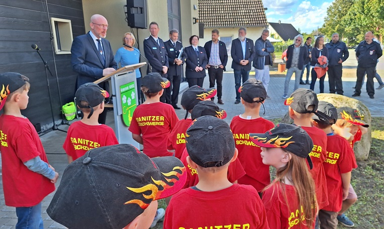 Am 12. September 2025 weihte die Freiwillige Feuerwehr Vietow ihr neues Gerätehaus ein. Unsere Löschzwerge wurden herzlich dazu eingeladen, um mit ihren Tänzen die feierliche Eröffnung zu umrahmen. Sie begeisterten alle Anwesenden mit ihrer Darbietung, beispielsweise den Minister für Inneres, Bau und Digitalisierung Christian Pegel, Kreisbrandmeister Mayk Tessin sowie unseren Sanitzer Bürgermeister Enrico Bendlin. Neben dem eigentlichen feierlichen Anlass gab es viel Lob für die beständige Arbeit mit den Löschzwergen in unserer Kita. Vom Förderverein der Ortsfeuerwehr Vietow und der Wehrführerin erhielten wir sogar eine Urkunde und kleine persönliche Geschenktüten. Anschließend hatten die Kids außerordentlichen Spaß auf der Fire-Truck-Hüpfburg, die nach dem starken Regenschauer vor der Veranstaltung richtig nass war. Die Eltern nahmen es gelassen, da es sehr warm war. Voller Feuereifer eroberten die Löschzwerge auch noch das blank geputzte Feuerwehrauto, das in der neuen Garage stand.